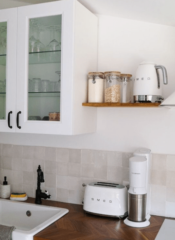 Si l’espace vous le permet vous pouvez choisir d’ajouter quelques rangements supplémentaires pour plus de praticité mais sans trop encombrer l’espace non plus. Il faut pouvoir bouger et respirer dans sa cuisine. Vous pouvez aussi opter pour de petites planches que l’on pose sur le mur.